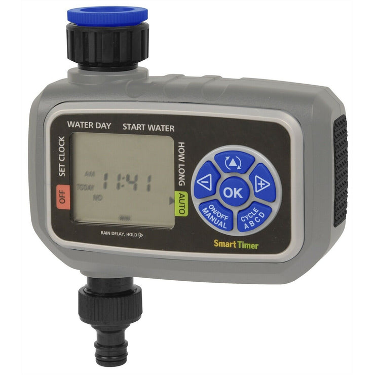 The Aqua Systems Automatic Electronic tap timer is a fully programmable and easy to use. It features a large LCD screen and dial which allows you to easily control water duration and frequency. The timer also has a manual ON/OFF watering feature as well as a rain delay function which will pause the program during bouts of wet weather.